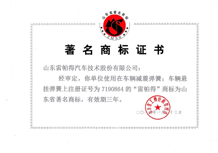 近期,山東省工商局公布了《山東省著名商標(biāo)認(rèn)定公告》,山東雷帕得汽車技術(shù)股份有限公司榜上有名,榮獲“山東省著名商標(biāo)”榮譽(yù)稱號(hào)。