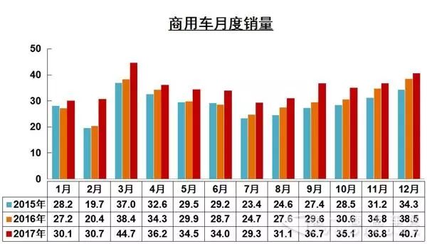 2017年,汽車產(chǎn)銷2901.54萬輛和2887.89萬輛,同比增長3.19%和3.04%,增速比上年同期回落11.27個百分點(diǎn)和10.61個百分點(diǎn)。其中,商用車產(chǎn)銷420.87萬輛和416.06萬輛,同比增長13.81%和13.95%。