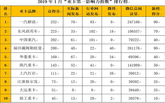 在2019年1月份(2018年12月31日-2019年2月3日)的五周內(nèi),國(guó)內(nèi)10家重卡企業(yè)(或品牌)的第一影響力指數(shù)總得分為1469分。就各家傳播表現(xiàn)來(lái)看,今年1月份,一汽解放的傳播力最強(qiáng),以252分摘得冠軍;東風(fēng)商用車以223分、中國(guó)重汽以202分,分別位居第二名和第三名。