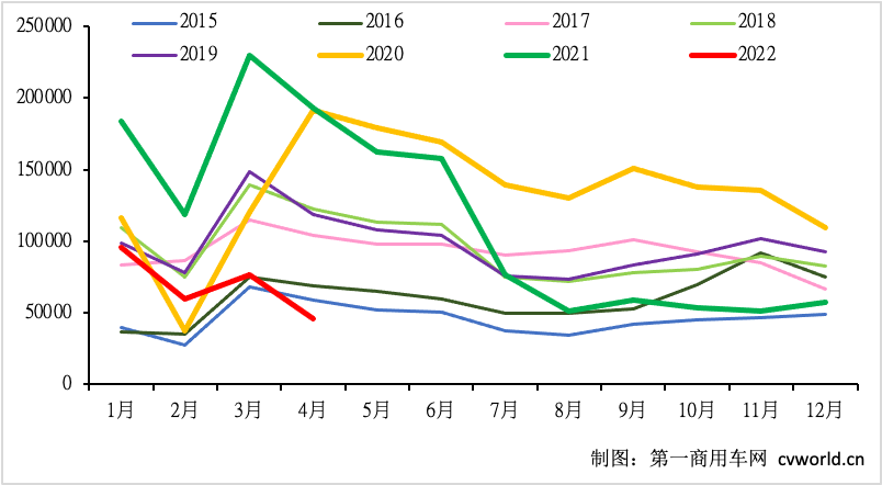 第三,上年同期基數(shù)過(guò)高,導(dǎo)致4月份的同比數(shù)據(jù)比較“難看”。根據(jù)中汽協(xié)會(huì)官方數(shù)據(jù),2021年4月的重卡銷(xiāo)量高達(dá)19.3萬(wàn)輛,這個(gè)數(shù)值是全國(guó)乃至全球重卡月銷(xiāo)量的歷史第二高點(diǎn)。如此之高的同期銷(xiāo)量基數(shù),今年4月份重卡市場(chǎng)不可能不出現(xiàn)大幅下滑。